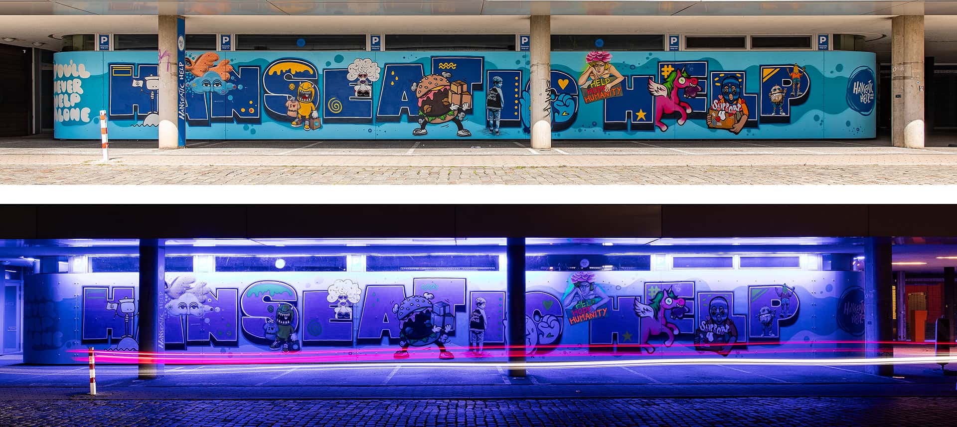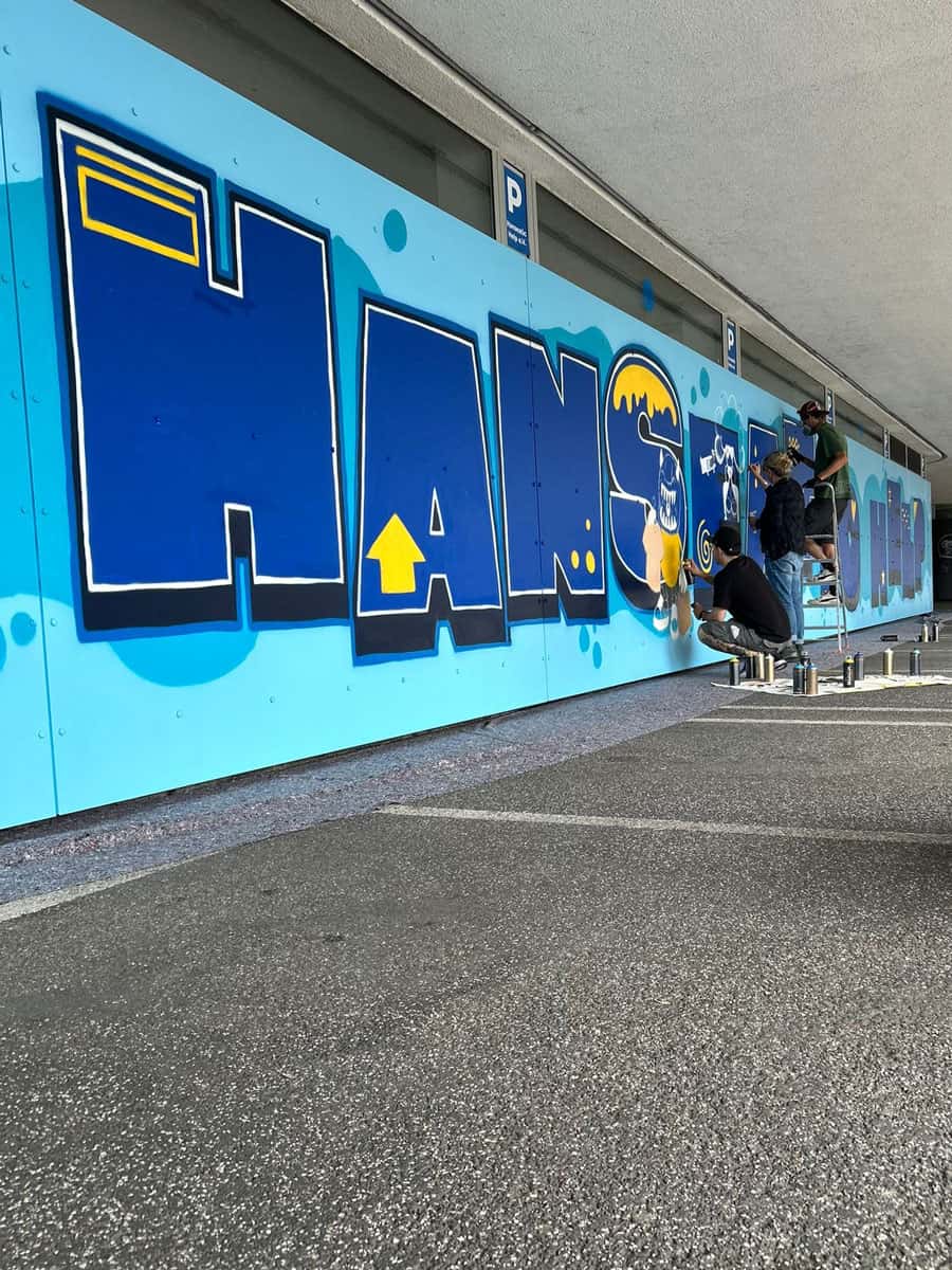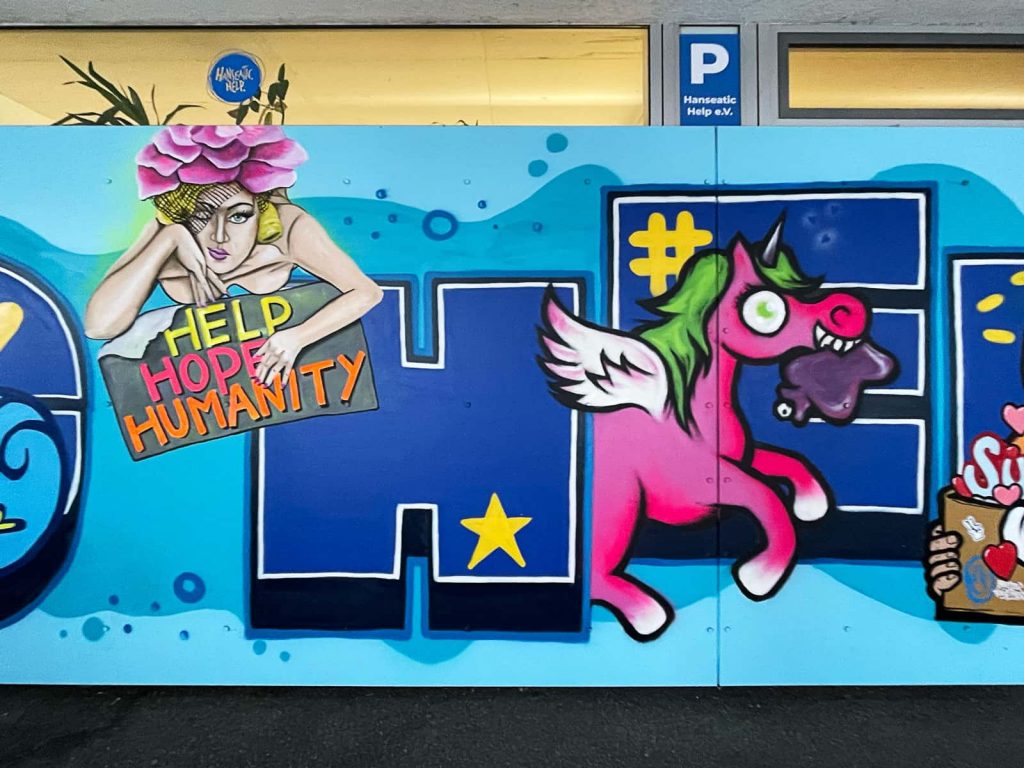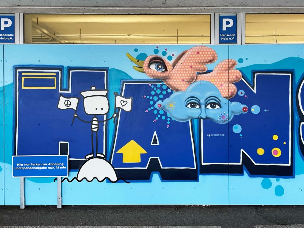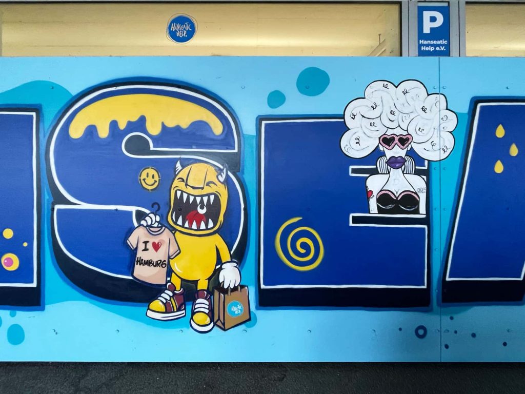 Das Briefing für das neue Mural an der Fassade von Hanseatic Help war, die Werte Gemeinschaft, Solidarität, Menschlichkeit, Hilfsbereitschaft, Nachhaltigkeit, Wirksamkeit, Engagement und die Verbundenheit zur Stadt Hamburg als Bild zu transportieren. Für die Umsetzung davon haben wir 11 Street Art Akteur*innen aus unserem erweiterten Netzwerk eingeladen, diese Vision gemeinsam umzusetzen. Die teilnehmenden Artists leben alle in Hamburg und sind bekannt für ihre unterschiedlichen Darstellungen von Characters. Vor dem Namen „Hanseatic Help“ als plakative, blockige Typografie fügen sich nun die vielfältigen Figuren der folgenden Artists zu einem schönen Gesamtbild zusammen (v.l.n.r.): Maens, Zonenkinder, Spe, Art.omato, SPÄM, Tona, Jumjum, Maaike Dirkx, Ain, Kid Overhead und Marshal Arts.