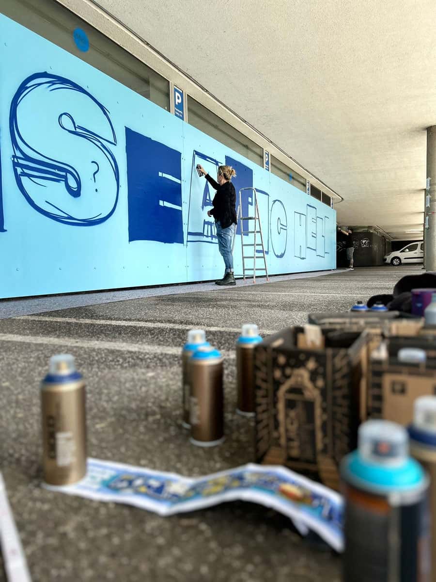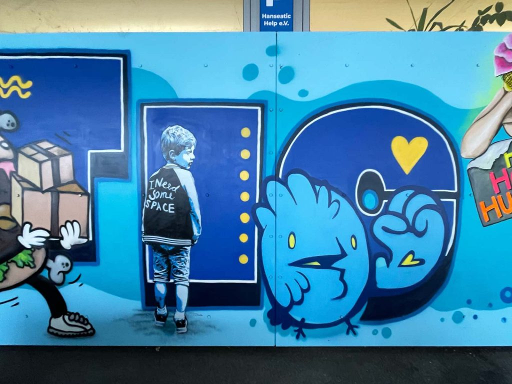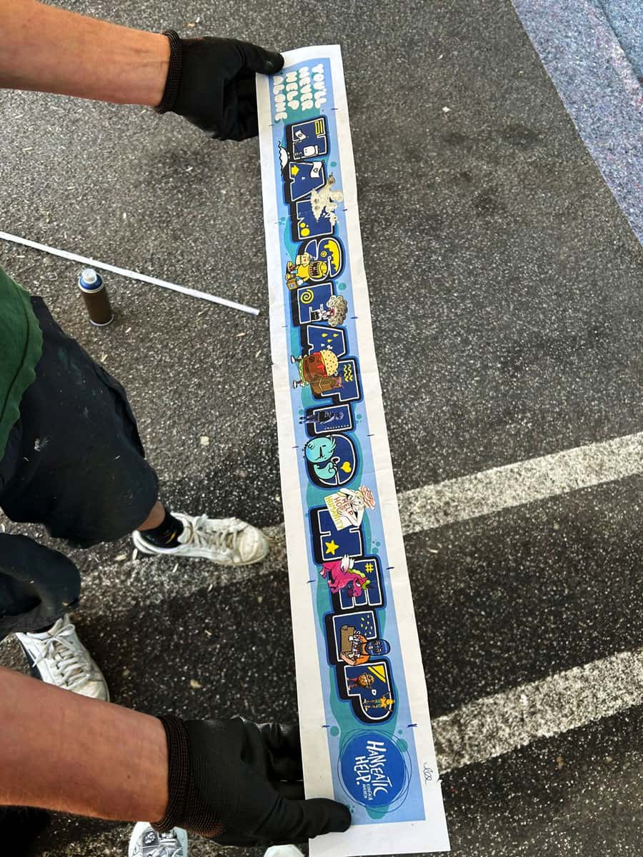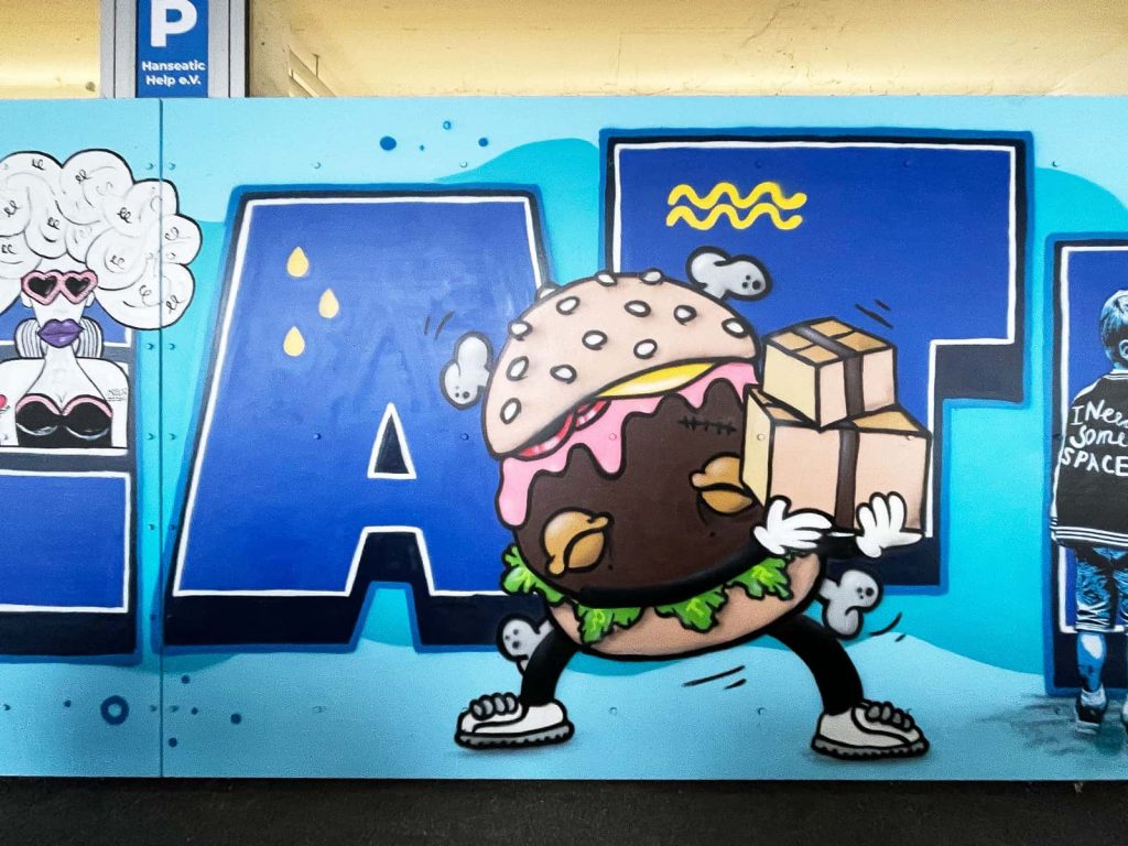 Das Briefing für das neue Mural an der Fassade von Hanseatic Help war, die Werte Gemeinschaft, Solidarität, Menschlichkeit, Hilfsbereitschaft, Nachhaltigkeit, Wirksamkeit, Engagement und die Verbundenheit zur Stadt Hamburg als Bild zu transportieren. Für die Umsetzung davon haben wir 11 Street Art Akteur*innen aus unserem erweiterten Netzwerk eingeladen, diese Vision gemeinsam umzusetzen. Die teilnehmenden Artists leben alle in Hamburg und sind bekannt für ihre unterschiedlichen Darstellungen von Characters. Vor dem Namen „Hanseatic Help“ als plakative, blockige Typografie fügen sich nun die vielfältigen Figuren der folgenden Artists zu einem schönen Gesamtbild zusammen (v.l.n.r.): Maens, Zonenkinder, Spe, Art.omato, SPÄM, Tona, Jumjum, Maaike Dirkx, Ain, Kid Overhead und Marshal Arts.